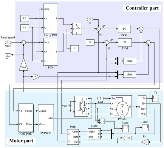 To evaluate the efficacy of the proposed improved synchronous control architecture, a six-axis motor synchronous control model is developed within the MATLAB/Simulink (R2021a) environment. The six AC permanent magnet synchronous motors (PMSMs) share identical parameters as delineated in Table 1. The simulation model, depicted in Figure 4, encompasses six single-axis control modules and synchronous compensator modules. Each single-axis control module comprises controllers and motors, as illustrated in Figure 5, where the PMSM adopts a vector control strategy with id = 0. Within the controller part, based on relevant studies [27,28,29] and combined with several simulation results, the parameters KP, KI, and KD are configured as 2.5, 0.3, and 0, respectively. The fuzzy theory domain of deviation e and the deviation rate of change ec are specified as [–10, 10], while the fuzzy theory domain of and are set to [–1, 1]. Furthermore, the quantization factors λe, λec, λP, and λI are established at 0.01, 0.0001, 7, and 3.5, respectively. In the synchronous compensator module, without synchronization control, deviation coupling control and improved deviation coupling control are separately implemented. The efficacy of these strategies is compared by real-time monitoring of speed variations across each axis.