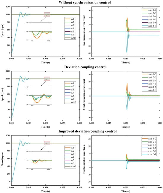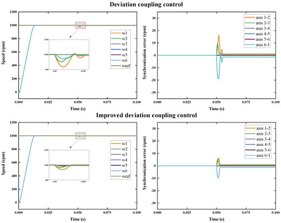 Upon integrating fuzzy PID, depicted in Figure 7, it is evident that the phenomenon of speed overshoot oscillation during motor startup is notably mitigated. The motor achieves a steady state in a mere 0.01365 s, representing a remarkable 51% reduction in time. Additionally, under fuzzy PID control, the motor attains a steady state faster following a sudden load addition. Table 3 illustrates that compared to the deviation coupling control strategy, the improved deviation coupling control strategy can decrease the maximum synchronization error by 48%, from 18.88 rpm to 9.81 rpm, and reduce the synchronization error adjustment time by 32%, from 5.59 ms to 3.78 ms.