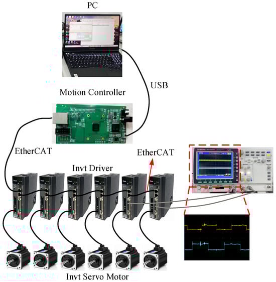 In order to verify the effect of the multi-axis synchronous control method, a six-axis control platform is built for experimental testing. As shown in Figure 8, the experimental platform consists of a PC, a motion controller (self-developed in the laboratory, using ARM + FPGA architecture), six servo drives (Invt SV-DA200 series, Shenzhen INVT Electric Co., Ltd., Shenzhen, China), and six servo motors (Invt SV-ML06-0R4G-2-1A0, Shenzhen INVT Electric Co., Ltd., Shenzhen, China).