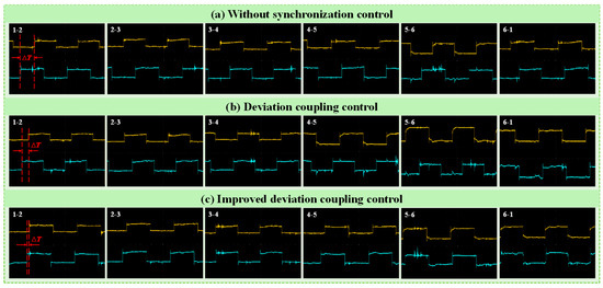 Experimental waveforms of adjacent two axes with different methods. (a) Without synchronization control; (b) deviation coupling control; (c) improved deviation coupling control. In the figure, the red dotted line illustrates the time difference ΔT between two adjacent axes.