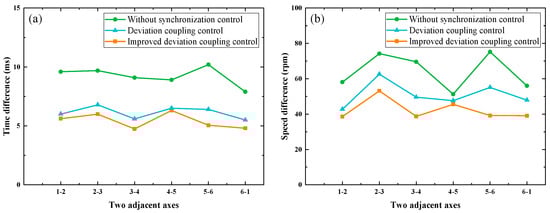 Experimental results of six-axis synchronous control with different methods. (a) Time difference between two adjacent axes; (b) speed difference between two adjacent axes.