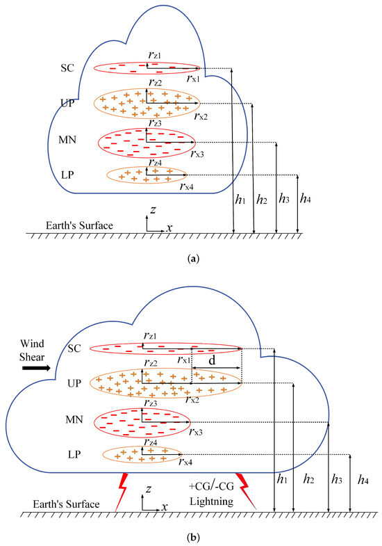 In recent years, a method widely used to develop and understand thundercloud charge structures is the physical thundercloud model which incorporates several complex factors, including induced electric charge, the state of lightning leaders, and the formation of corona regions [25,26,27]. For analyzing the actual thunderstorm process at the mirco-physical level, this method highly relies on observation data, which makes it computationally expensive over large-scale domains. Nowadays, the numerical thundercloud model coupled with the empirical governing equations become widely popular in studying the configuration and dynamics of thunderclouds [18,23,24,28,29]. This stochastic model based on electrostatic concepts presents the cloud model in an axisymmetric manner, employing the non-inductive charging approach to describe the electrification of the thundercloud. Although this modeling technique is complex and requires significant time, it is remarkably efficient in capturing the dynamic evolution of a thundercloud that could be useful to identify the precise locations on Earth’s surface or any object in danger due to thunder or lightning.