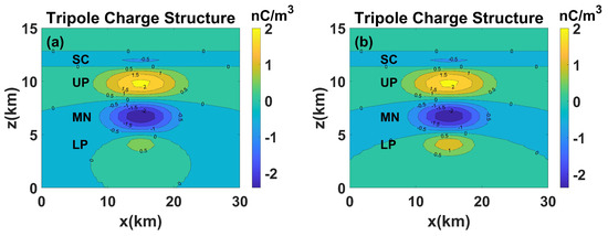 The vertical profile of the pyroCb thundercloud model (in xz plane) exhibits a tripole charge structure under two different conditions: (a) without LP charge enhancement (configuration 1) and (b) with increased LP charge region (configuration 2).