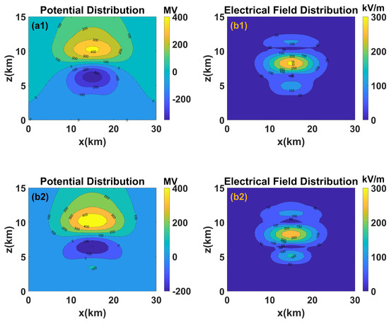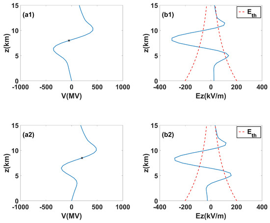 Graphs depicting the electric potential V (MV) are shown at the point of maximum field where the initiation of flash is marked with an “x” (a1,a2). The longitudinal electric field (kV/m) for two different thundercloud configurations is also illustrated in (b1,b2).