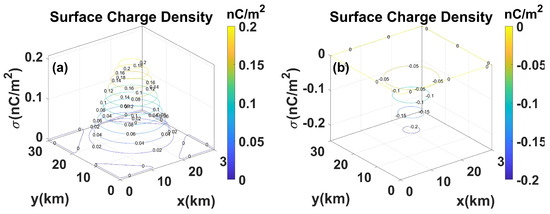 Plots of surface charge density for: (a) configuration 1 and (b) configuration 2 to identify probable CG lightning types in pyroCb thunderclouds. Detailed views of the temporal changes in on Earth’s surface ( plane) are presented for two tripole charge configurations.