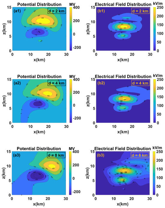 To examine the consequences of wind shear on a pyroCb thundercloud and how the displacement of its charge layers influences potential lightning strike areas, the parameters and of both SC and UP charge layers are altered while keeping the MN and LP charge structures the same as configuration 2 in Table 1. The vertical cross-sectional view in Figure 7 illustrates how strong wind shear displaced the charge layers in pyroCb thunderclouds, causing an impact on the overall distribution of thundercloud-generated potential and electric field (see Figure 8). In Figure 7a–c, the extension parameter d is varied by 2, 4, and 8 km, respectively, while maintaining the value of constant to ensure the overall charge of the affected charge regions remains constant. With the wind shear extension in the SC and UP regions, growth in negative potential is observed, particularly in the middle region of the pyroCb thundercloud, as depicted in Figure 8(a1–a3). Furthermore, the magnitude of the electric field (Figure 8(b1–b3)) within the thundercloud decreases with the rightward lateral extension of SC and UP charge layers, aligning with the principles of the electrostatic field.