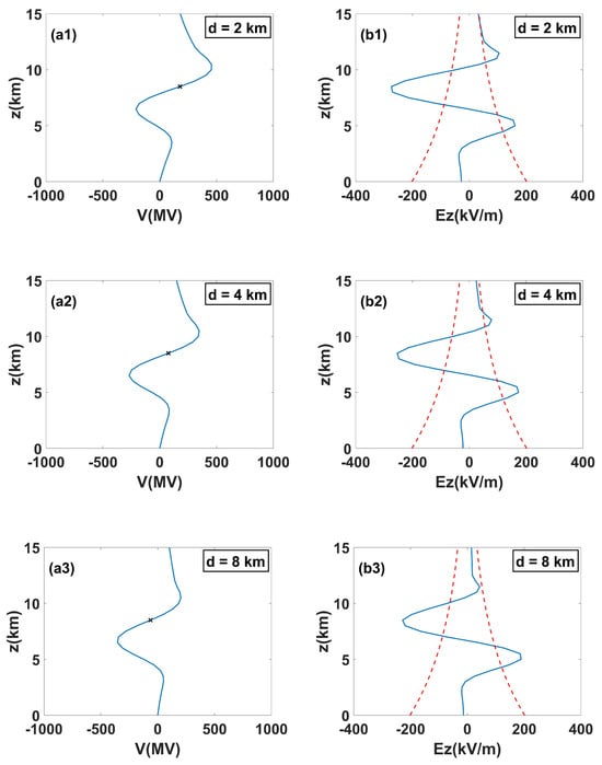 Graphs showing the electric potential V (MV) at maximum field point of pyroCb thundercloud (a1–a3) and its corresponding longitudinal electric field (kV/m) (b1–b3) under the effect of wind shear. The symbol “x” in (a1–a3) represents the flash initiation point, and the red-dashed dotted line in (b1–b3) indicates the initiation threshold field.