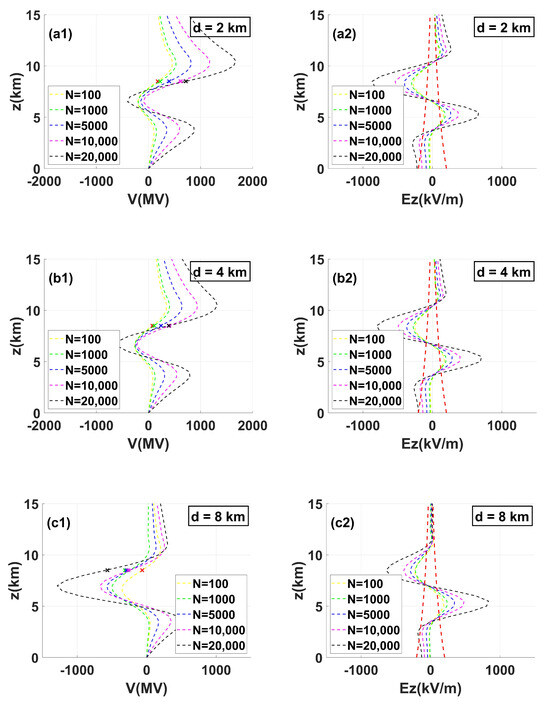 Figures illustrating (a1–c1) the electric potential V (MV) at maximum field point, and (a2–c2) the longitudinal electric field (kV/m) for pyroCb thundercloud with wind shear extension values of (a) , (b) and (c) km. The threshold field value of initiation is shown by red dash-dotted lines.