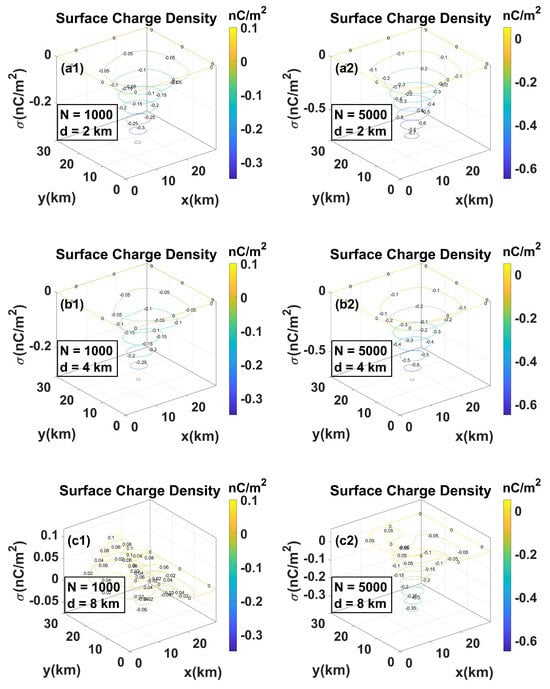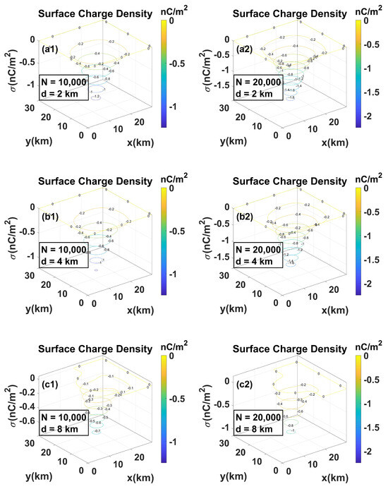 Variations in surface charge density in pyroCb for aerosol concentrations: 10,000 cm−3 (a1–c1) and 20,000 cm−3 (a2–c2).
