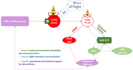 The operation procedures of the management of tasks assigned to the “external UAS fleet” (i.e., teams not belonging to CNVF) have been established in agreement with the CNVF according to a basic scheme in which UAS CCT collected information from each single operator and communicated it to the CCOA. The defined standard scheme is as follows: