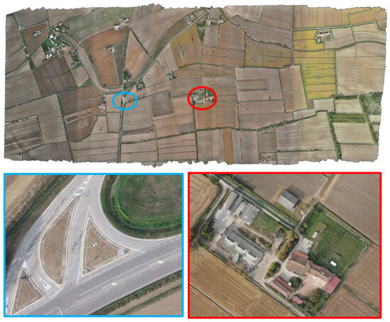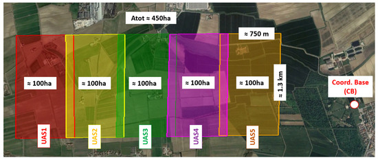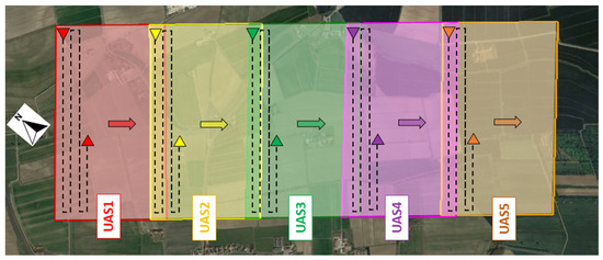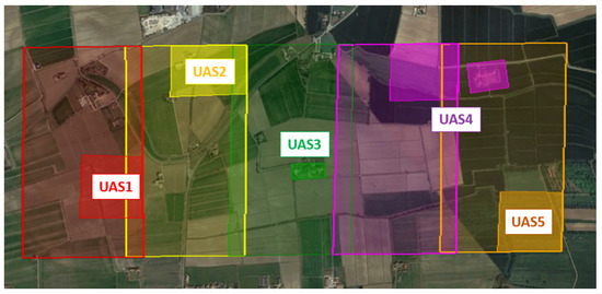 The test site selected for the in situ application of rapid mapping, located between the municipalities of San Giorgio Bigarello and Castel Belforte (in province of Mantua in Italy—see Figure 3), is a large rectangular area (of about 450 ha) with a flat morphology and the possibility for the pilots to walk across in order to ensure that the VLOS (visual-line-of-sight) conditions are met (at the time of application, this is still a mandatory requirement). The total area has been mapped operating five UAS teams flying simultaneously on a sub-area of about 100 ha each, with a relative overlap of about 10–15% of the single sub-areas (see Figure 3). These sub-areas have been established based on the capabilities of each UAS and the input flight planning parameters reported in Table 1, considering that each team had to guarantee approximately one hour of continuous flight.