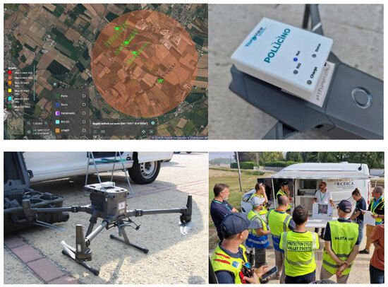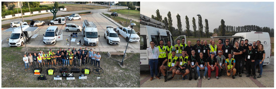 The overall on-site activity took place in two days, the 10th and 11th of October 2023, and involved a total of 35 participants from the Competence Centres of the Italian Civil Protection Department (listed in Section 1) and 11 multi-rotors (Figure 4). The weather conditions during all the days were generally favorable (good visibility and temperature around 20 °C).