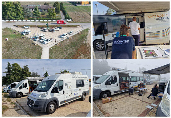 - Individual technical activities, which saw the participation of the EUCENTRE teams in collaboration with the CNVF, the Municipality of Monza for the survey of some structures and the municipalities of Quistello, Monza and Milan for surveillance/public safety activities. As mentioned above, these activities will not be discussed in detail within this paper.