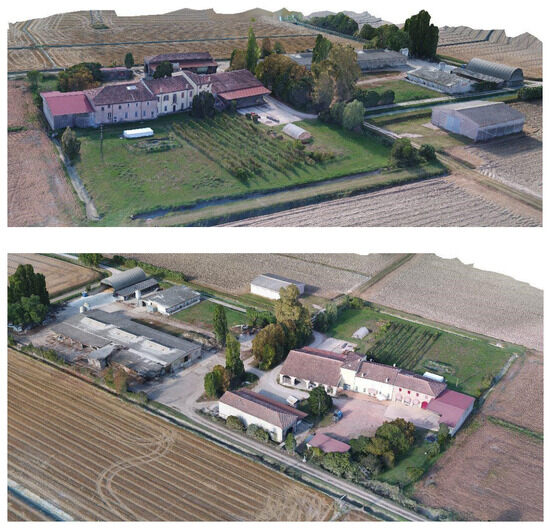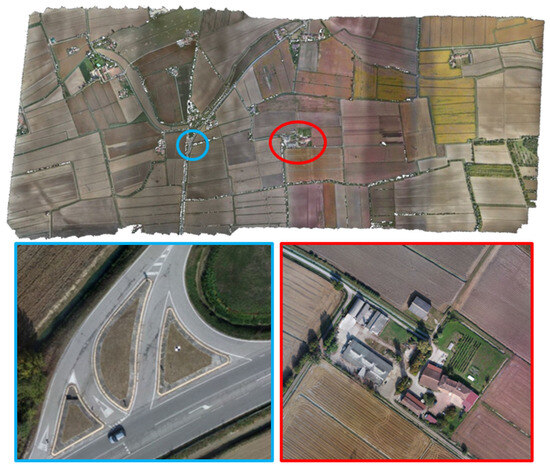 The joint technical activity consisted of the so-called “emergency aerial photogrammetry”, i.e., the deployment of multi-rotors UAS teams to map a medium–large area affected by the seismic event. As reported in more detail in Mandirola et al., 2021 ([32]), this joint activity has two main general goals with different levels of time constraints and result accuracy demands. The first goal in the immediate response phase is to provide essential and timely information to the authorities in charge of disaster response activities (e.g., the National Civil Protection). In this phase of rapid mapping, in order to survey and transfer the preliminary results in the shortest possible time, a high level of detail and spatial resolution (ground sampling distance—GSD) is not really necessary. The information delivered could be in the form of low-resolution (e.g., 10 cm/px) orthophoto able to provide a near real-time picture of the affected area, allowing a fast assessment (e.g., identification the access points, prioritization of the field inspections and post-event reconnaissance activities). In a second phase, when the timeliness of the delivery is less demanding, or upon specific requests, additional data can be acquired (e.g., flights with oblique camera, lower flight altitude/GSD, larger lateral overlap), or more accurate products can be provided (e.g., 3D point clouds, 3D models, digital elevation models or orthophoto obtained with higher accuracy parameters with respect to previous results). These data can offer the metrics base for advanced activities, such as the assessment of debris volume ([32]) or numerical modeling of the disaster impacts (e.g., impact on the structural performance of infrastructure [25]).