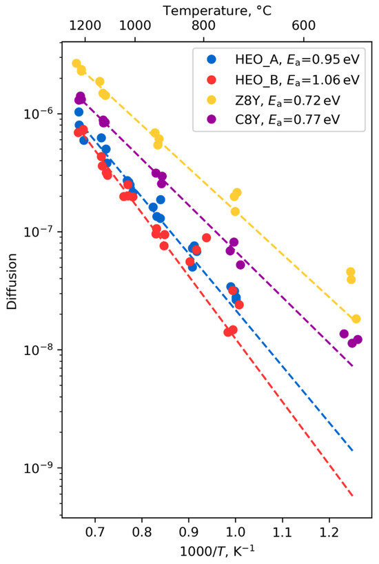 Oxygen ion diffusivities and calculated activation energies for two ESOs HEO_A, Zr(1−x)/3Hf(1−x)/3Ce(1−x)/3Gdx/2Yx/2O2−x, HEO_B Zr(1−x)/3Hf(1−x)/3Ce(1−x)/3Yx/2Lax/2O2−x at x = 0.14 (8%RE2O3) compared with predicted oxygen ion diffusivity for Z8Y and C8Y.