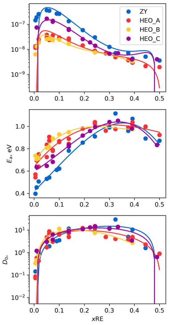 The plots show (top) the overall diffusivity of the three HEOs and Z8Y as a function of the doping concentration together with (middle) the activation energy and (bottom) the pre-exponent. In each plot, the colored points show the individual data points and the solid lines show the data fitted to the activation energy and pre-exponent.