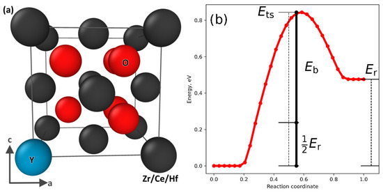 Plot showing (a) the fluorite structure with metal ions colored blue (Y) or black (Ce, Hf, and Zr) and oxygen ions as red. An oxygen vacancy exists at (1/4, 1/4, 1/4), which, in this example, is adjacent to a Y3+ ion. The calculated transition path (b) in moving this vacancy to the next nearest neighbor position, i.e., to (3/4, 1/4, 1/4). The overall transition barrier Ets is split into a reaction energy Er and a barrier energy Eb.