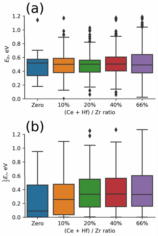Box and whisker diagram of the population of (a) reaction energies (Er) and (b) barrier energies for oxygen vacancy diffusion for 6.25% Y doping in ZrO2 with progressively greater amount of Ce and Hf additions.