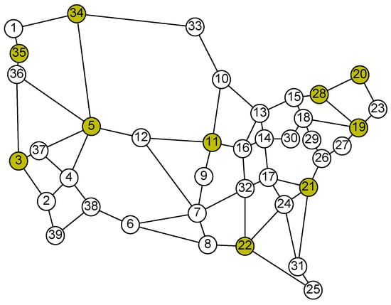Simulations were performed using the US-backbone topology []. This network consists of 39 nodes connected by 61 bidirectional links. The network has 10 nodes that act as PE switches (points of attachment of destination networks and traffic sources). Specific nodes (PEs) are chosen to function as connection points for both traffic sources and destinations (Source-Client Network—SCN, and Destination-Client Network—DCN), as illustrated in Figure 2. DCNs and SCNs are networks in which destinations and sources of traffic reside. DCNs and SCNs can be reached via PE nodes. All inter-node links were assigned 100 Mb/s of bandwidth with a delay of 1 ms. The links between the PE and the source and destination nodes were set to 1 Gb/s with a delay of 1 ms. Network traffic was generated using the internal pseudo-random number generator of the ns-3 simulator.