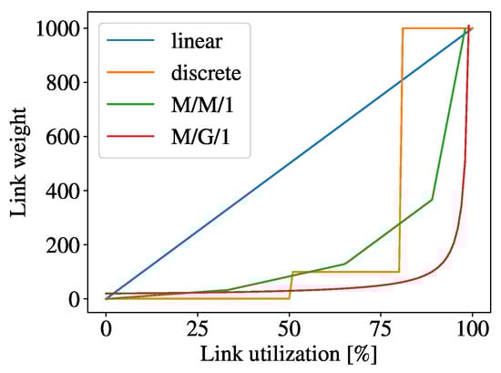 - Discrete scenario: In this scenario, the weight of the link remains constant within a specified range of link utilization. This approach ensures a straightforward and stable weighting mechanism that responds predictably to variations in link traffic.