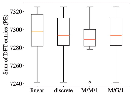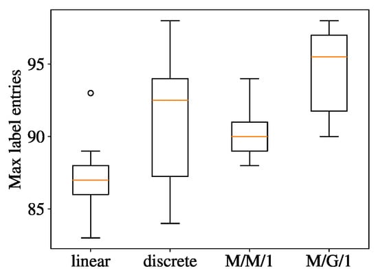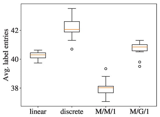 The collected results lead to the following conclusions. Our analysis was conducted with the aim of maximizing throughput while minimizing the number of entries in the flow tables. In addition, we examined the impact of selected scenarios on transmission delay. Table 1 shows that the best throughput is achieved using the linear scenario. The highest number of table entries was reached using the M/M/1 scenario. At the same time, this scenario resulted in the fewest table entries in the edge nodes (PE). The discrete scenario achieved the lowest throughput among the proposed scenarios and the highest delay. Despite the large number of flow entries, applying the discrete scenario to our mechanism allows significant flow reduction and aggregation (Figure 7 and Figure 8).