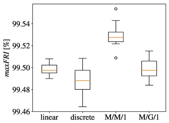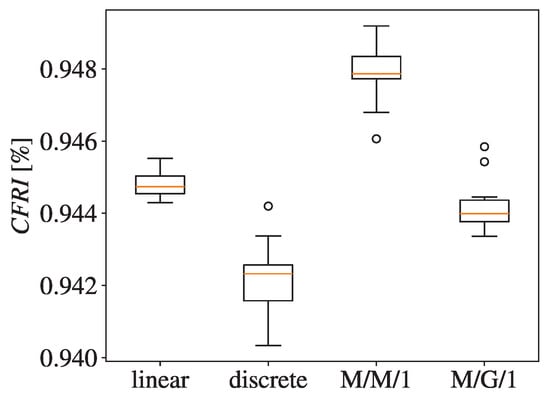Furthermore, to measure the reduction in the number of entries in the switching tables, we propose the following indicator: the maximum Flow Reduction Indicator () Equation (2). To calculate , it is necessary to distinguish between the entries in the DFT of the PE switches (flows) and the aggregated entries in the P switches (labels). In each second of the simulation, the total number of entries in the DFT was observed in all PE switches. This value is the sum of the number of flows in the network per second. At the same time, the average number of aggregated entries in P switches (labels) was observed in each second. This number is the average number of aggregated flows in the entire network. The highest value of this number (worst case) was used to calculate . The proposed indicator is expressed by Formula (2) and determines the percentage reduction in the number of entries in the switching tables compared to the situation if traditional SDN switching were used. It should be emphasized that is calculated for the scenario in which all flows in each PE node are served by all P nodes.