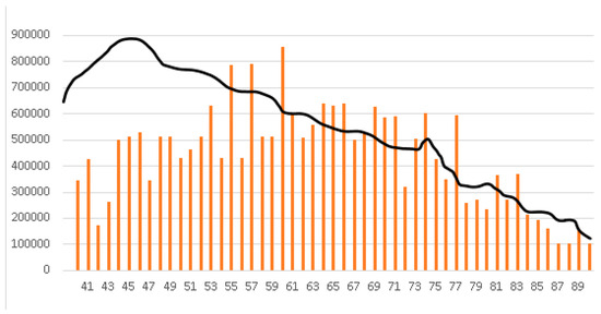 The black line represents the population between 40 and 90 years old residing in Spain in July 2022 (data collected by the INE). The orange bar represents the distribution of the sample based on their age.
