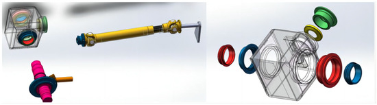 To facilitate the subsequent dynamic simulation, the model is simplified by deleting the upper and rear covers of the box as well as all bolts, nuts, and spacers, and the traction motor is replaced by a bracket to optimize the hermetic structure of the gear, axle, and box. The exploded view of the optimized gearbox modeling is shown in Figure 3.