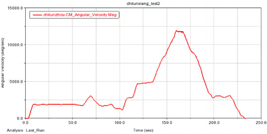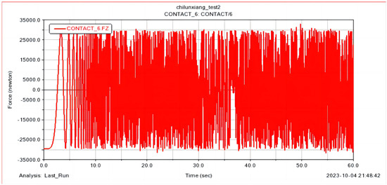 The motor input time is 60 s and the angular velocity is 0–18,000 d/s. The gear meshing force curve is shown in Figure 4. According to related research [34], the bevel gear meshing force is about 25 KN under an approximate working condition; the simulation results are consistent with this measurement.