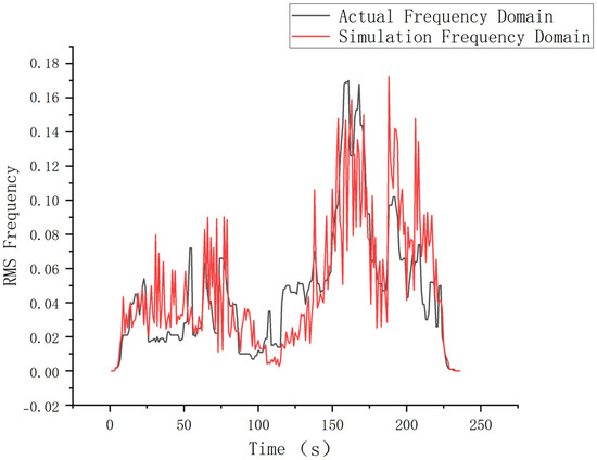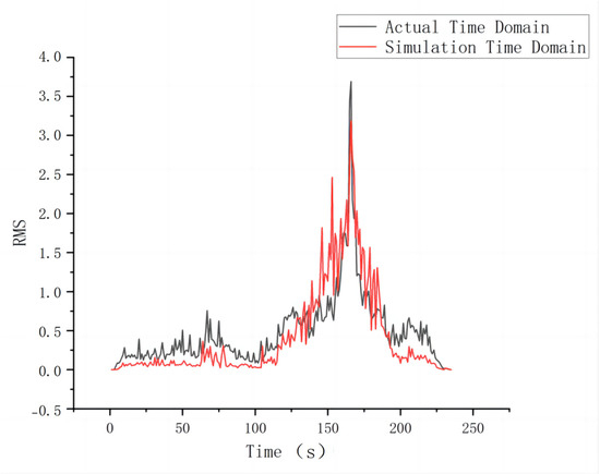 The vibration data from the online monitoring system of China Railway will be preprocessed, and the Root-Mean-Square (RMS) of the time-domain vibration acceleration every 5 s will be displayed as the time-domain characteristic value. After calculating the RMS of the simulated time-domain vibration acceleration and comparing the time-domain characteristic value of the actual operation, it is found that the general trends of the two coincide with each other. The actual and simulation comparisons are shown in Figure 6.