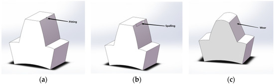 Critical stages of a single tooth degradation of driving gear. (a) Pitting; (b) spalling; (c) wear.