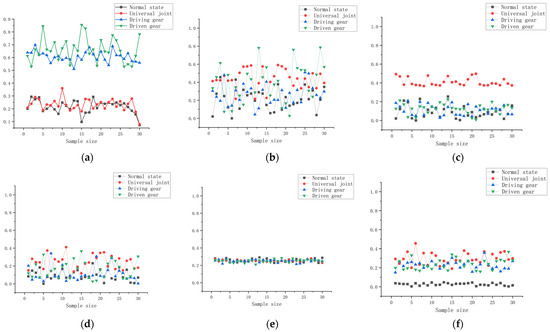 Taking a 1500 rpm working condition as an example, there are 3000 sampling points of vibration acceleration in the normal state and degradation process of the key components of the gearbox, and every 100 sampling points of each state type are intercepted as a sample, for a total of 30 samples for each state type. The six characteristic indexes in time and frequency domains are calculated, respectively, and, after normalizing the calculation results, the comparison diagrams of normal state and degradation positions are shown in Figure 11. Among them, the RMS, kurtosis index, and RMS frequency have better sensitivity to component degradation, but they cannot be accurately differentiated for fault location.
