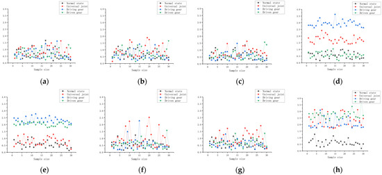 Comparison of wavelet packet decomposition feature metrics. (a) W(3,0); (b) W(3,1); (c) W(3,2); (d) W(3,3); (e) W(3,4); (f) W(3,5); (g) W(3,6); (h) W(3,7).