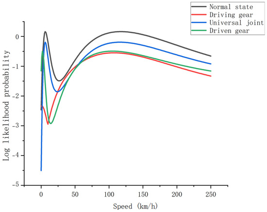 The hybrid feature domain is substituted into the GRU for feature fusion, and the initial vectors and state transfer matrices are updated. The log-likelihood probabilities of the initial vector updates for each hidden fault type are shown in Figure 13. Where the log-likelihood probability of the driving gear increases at increasing speed levels, especially at high speeds, the risk of failure of the driving gear increases. The log-likelihood probability of the universal joint has the highest risk of failure at moderate speeds. The log-likelihood probability of the universal joint has the highest risk of failure at moderate speeds. The log-likelihood probability of the driven gear is higher at lower speeds, decreases with increasing speed, and then increases again at higher speeds, indicating that the risk of failure of the driven gear is higher at low- and high-speed operations.