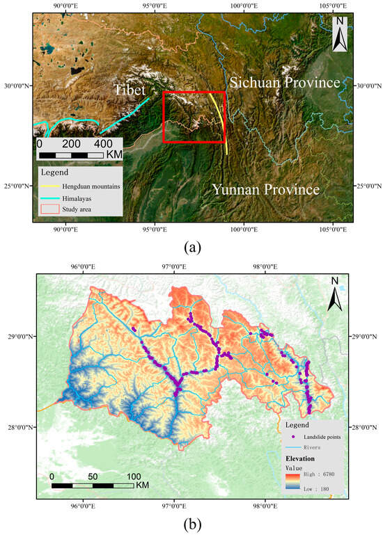 Study area: (a) satellite image; (b) overview map of Zayu county.