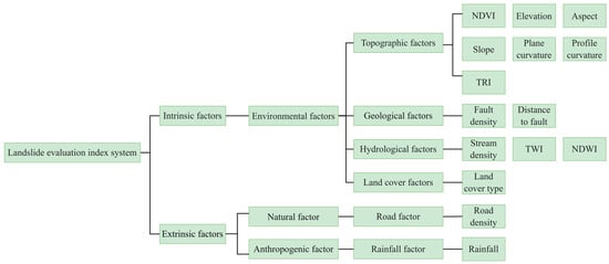 The evaluation index system of landslides is crucial in assessing landslide hazards and evaluating susceptibility. In this study, the landslide index system is divided into two major parts: intrinsic factors and extrinsic factors. Based on the geographical conditions of Zayu County and scientific selection principles, 15 evaluation factors, such as elevation, aspect, and slope, were selected []. The constructed evaluation index system is illustrated in Figure 2.