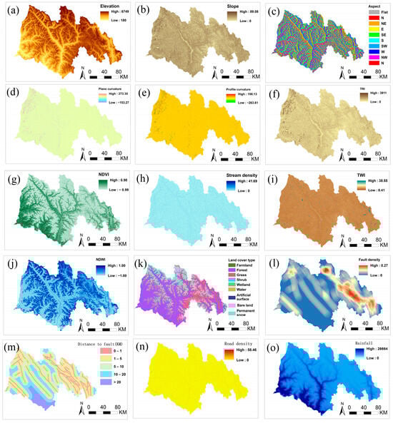 Group of landslide evaluation factors: (a) elevation; (b) slope; (c) aspect; (d) plane curvature; (e) profile curvature; (f) TRI; (g) NDVI; (h) stream density; (i) TWI; (j) NDWI; (k) land cover type; (l) fault density; (m) distance to fault; (n) road density; (o) rainfall.
