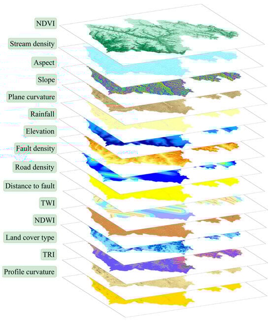 First, factors closely related to landslides, such as slope, aspect, and elevation, were selected. All raster grid rows and columns were aligned to 6737 × 10,053 pixels, with a uniform resolution of 30 m. The various factor layers were stacked and placed to form an array with a shape of (6737, 10,053, 15), as illustrated in Figure 4.