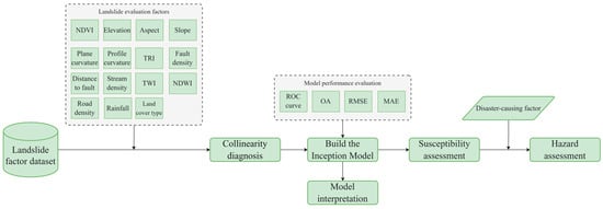 The flowchart for landslide hazard evaluation and interpretable analysis using Inception modeling in connection with rainfall.