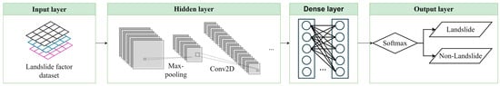 This study constructed an Inception model based on the structure of deep learning models, as shown in Figure 7. This model included an input layer, hidden layers, fully connected layers, and an output layer. The input layer converted the original image data into a digital form that the model could process. The hidden layers consisted mainly of convolutional layers and max-pooling layers. The fully connected layers integrated all the features extracted from the previous layer into a high-level abstract feature representation proper for landslide classification. The model output was binary classification using softmax, outputting “landslide” or “non-landslide” results.