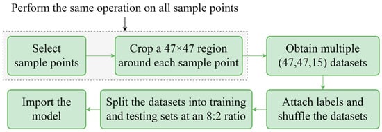 Before training the model, the landslide factor dataset was preprocessed to generate data that met the model’s input requirements. According to the First Law of Geography, objects closer together have a stronger correlation. In this study, we selected a region measuring 47 by 47 units centered around each sample point, both positive and negative, for cropping purposes. The landslide factor dataset was divided into multiple datasets of shape (47,47,15), labeled with corresponding “landslide” and “non-landslide” labels, shuffled, and divided into training and testing sets at a ratio of 8:2. These datasets were then imported into the model for multiple rounds of training and fitting validation. By setting different training parameters, the optimal parameter combination was eventually obtained. The data processing process is shown in Figure 8 below: