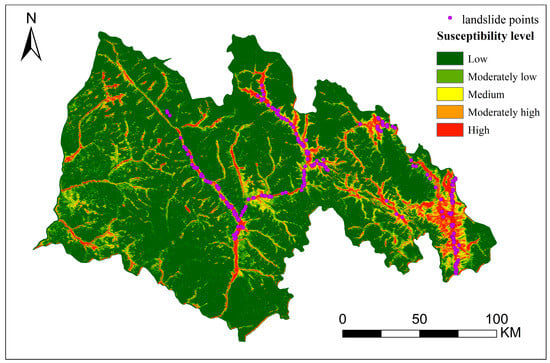 The Inception model was used to predict the landslide occurrence probability for each pixel in the study area, obtaining a landslide susceptibility evaluation map for the Inception model (Figure 9). The susceptibility levels were classified into five levels using the natural break method: low, moderately low, medium, moderately high, and high.