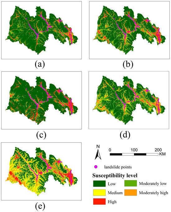 After 150 repeated trainings, the results of the best-performing models in terms of their accuracy metrics were selected for landslide susceptibility evaluation. The accuracy and sensitivity of the chosen models are shown in Table 5.