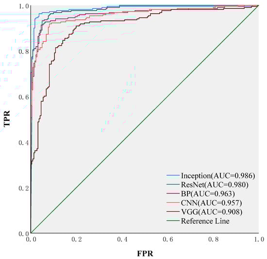 Based on the parameter configuration mentioned above, 150 independently trained models were batch-generated for each model type (Inception, BPNN, ResNet, CNN, VGG-16) to explore the adaptability and generalization performance of the different architectures for the “landslide susceptibility” task under the same training conditions.