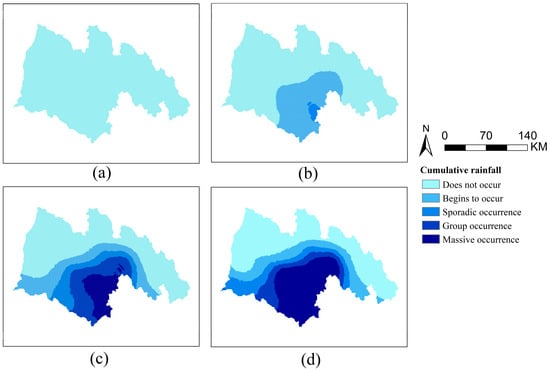 The threshold for rainfall-induced landslides was divided into five levels: does not occur, beginning to occur, sporadic occurrence, group occurrence, and massive occurrence, corresponding to cumulative rainfall thresholds of 100 mm, 140 mm, 170 mm, and 200 mm []. The reclassified results of the cumulative rainfall grid are shown in Figure 12.