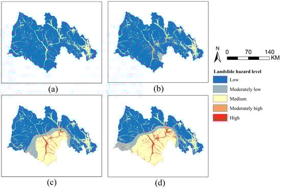 Landslide hazard prediction map for the “25 April 2010, heavy rainfall in Zayu, Tibet”: (a) 22 April; (b) 23 April; (c) 24 April; (d) 25 April.