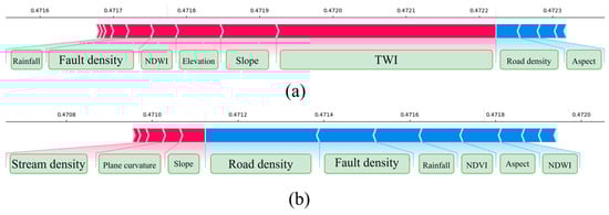 In the positive sample point, the Terrain Wetness Index (TWI) had the greatest impact on the model predicting positive results (landslides), followed by slope and elevation. Road line density had the greatest impact on the model predicting negative results (non-landslides). Overall, the driving force for predicting positive results was much greater than predicting negative results, so the model output for this sample point was a landslide. Similarly, as shown in Figure 14b, the factors with the greatest impact on positive prediction were slope and plan curvature, while road line density had the greatest impact on negative prediction. Therefore, the model output is non-landslide.