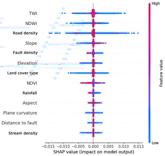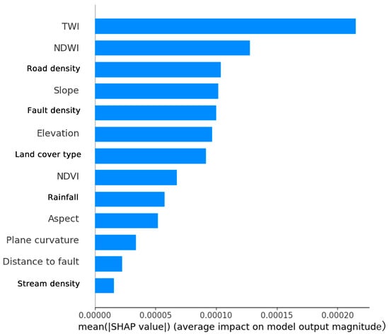 The importance level of each feature was obtained by calculating the mean absolute SHAP values for each feature. In this study, the “plot_type” parameter of the “summary_plot” function in the SHAP library was set to “bar” to generate a standardized bar chart for intuitive display (Figure 16). The most important features in the landslide susceptibility in Zayu County were TWI, NDWI, road line density, and slope, which had the greatest impact on the model’s output. In contrast, the contributions of the water system line density and distance to fault to the model output were not high.