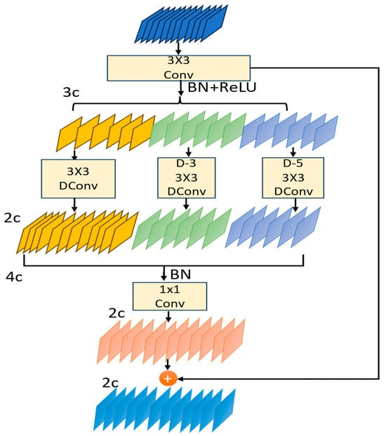The DRB module, known in full as the dilated reparam block [29] extended reprameterization module, utilizes a compact kernel and multiple layers with varying dilation rates to enhance a larger kernel convolutional layer. Its key hyperparameters include the size (k) of the larger kernel, the size (k) of the parallel convolutional layers, and the rate of expansion (r). Figure 4 depicts the scenario with four parallel layers, indicated by k = 9, r = (1, 2, 3, 4), and k = (5, 5, 3, 3). For greater K, we can employ more expansion layers with bigger kernel sizes or expansion rates. The core size and expansion ratio of parallel branches are flexible, the sole restriction being (k − 1) r + 1 < k.