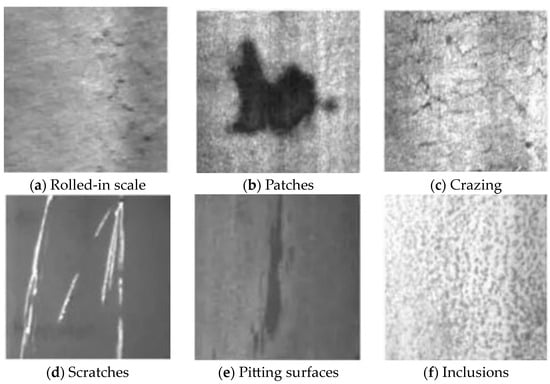 The NEU-DET [32] dataset was utilized in this study, consisting of a steel surface dataset from Northeastern University on which training and validation were performed. This dataset contains 1800 images in total, consisting of six categories of classified defects, and each type of defect is exemplified by 300 images which contain rolled-in scale (RS), patches (Pa), crazing (Cr), scratches (Sc), pitting surfaces (Ps), and inclusions (In), as shown in Figure 5. The dataset images contain 200 × 200 pixels and the total of 1800 images were randomly divided into an 8:1:1 ratio to create NEU-DET training, test, and validation sets, i.e., 1440 training samples, 180 test samples, and 180 validation samples.